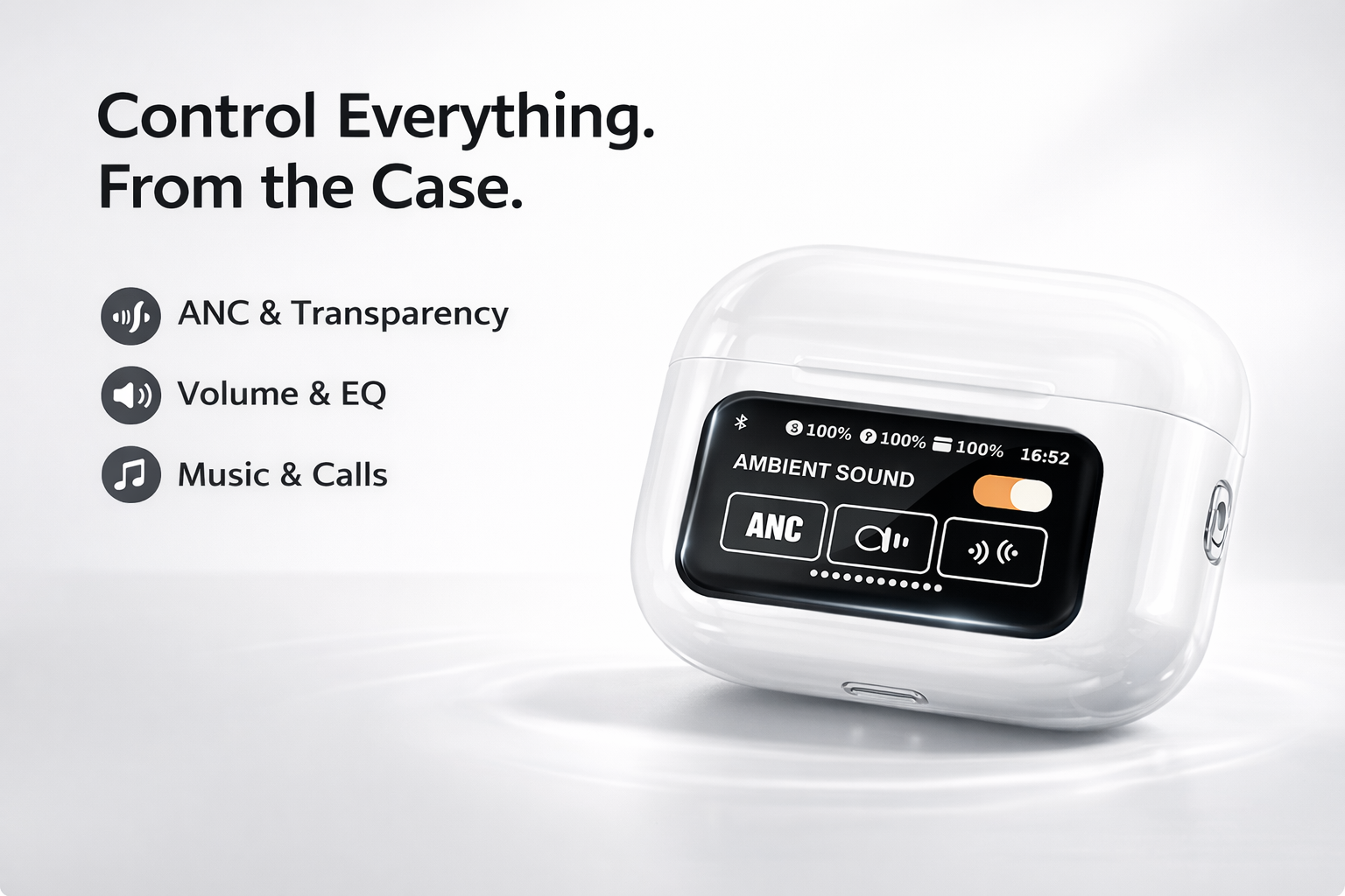 Control everything directly from the case. Easily manage ANC and transparency modes, adjust volume and EQ, control music and calls, find your earbuds, or use remote camera control — all without opening your phone.