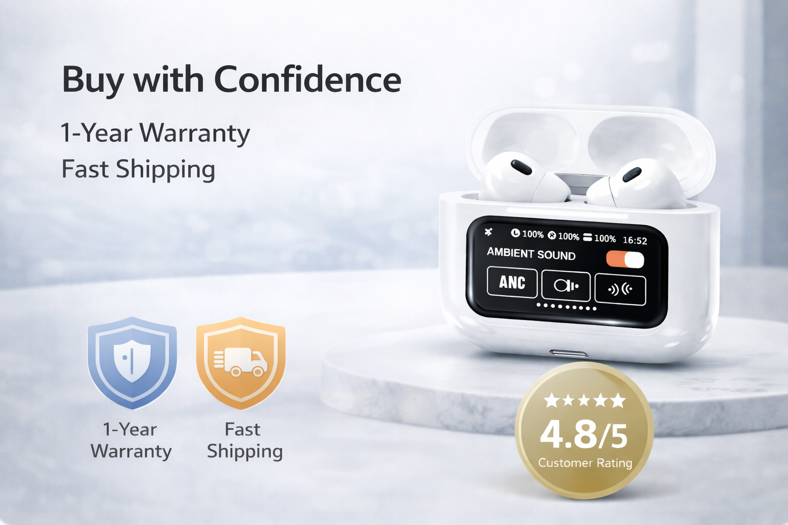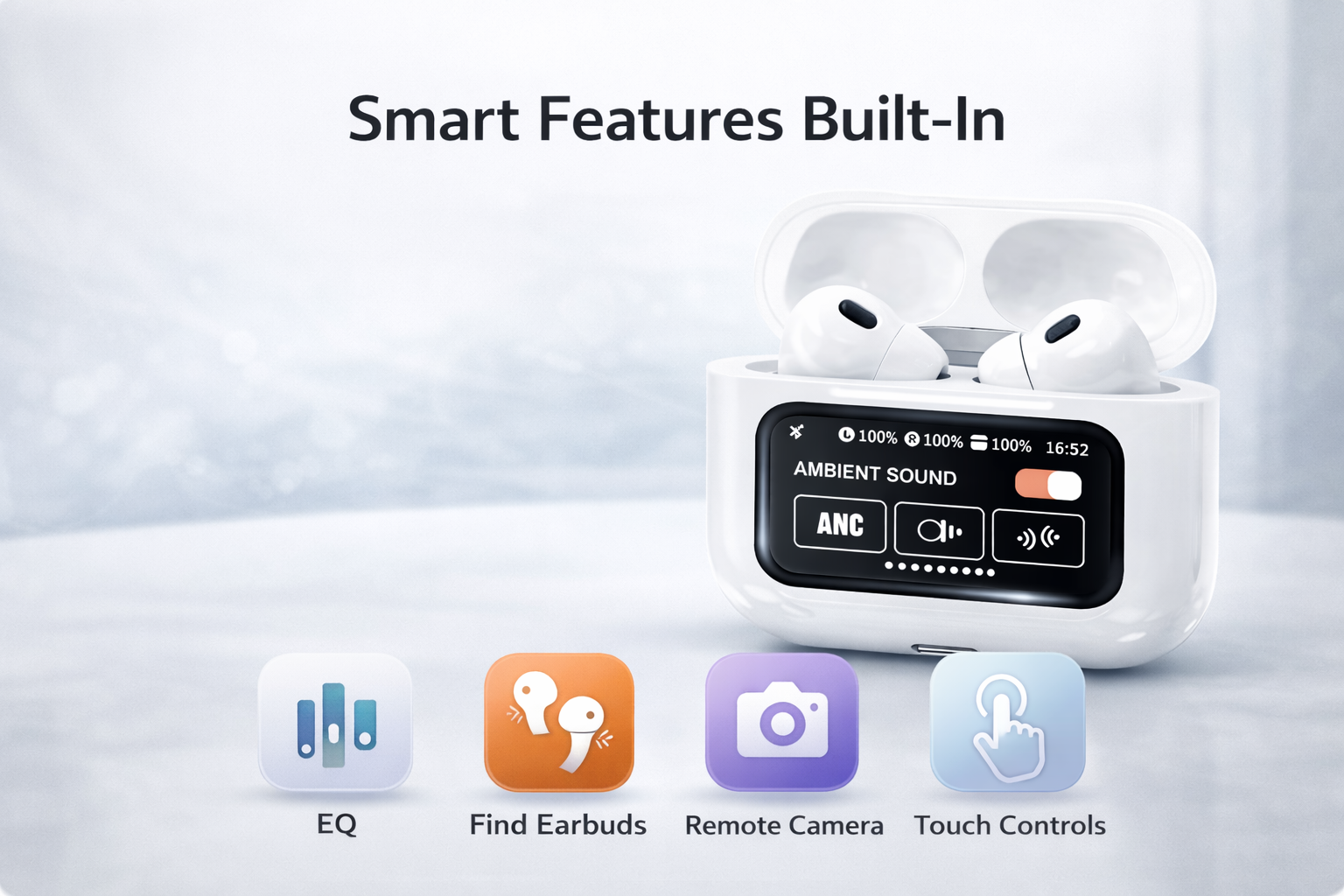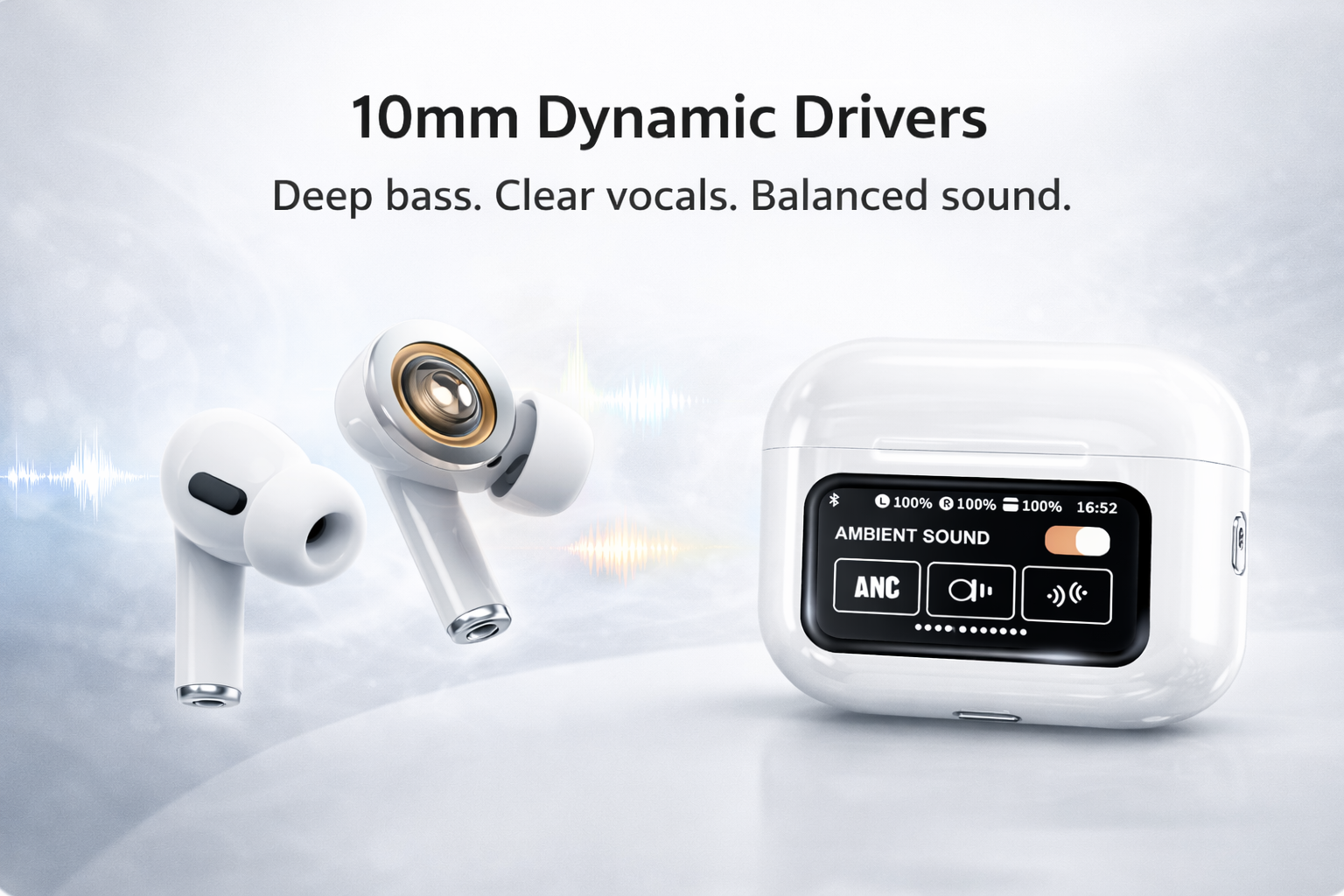 🎧 Premium sound, smart controls, and all-day comfort — designed for everyday listening, calls, and travel. These true wireless earbuds combine active noise cancellation, powerful audio performance, and an intuitive smart touch display case for total control without reaching for your phone.