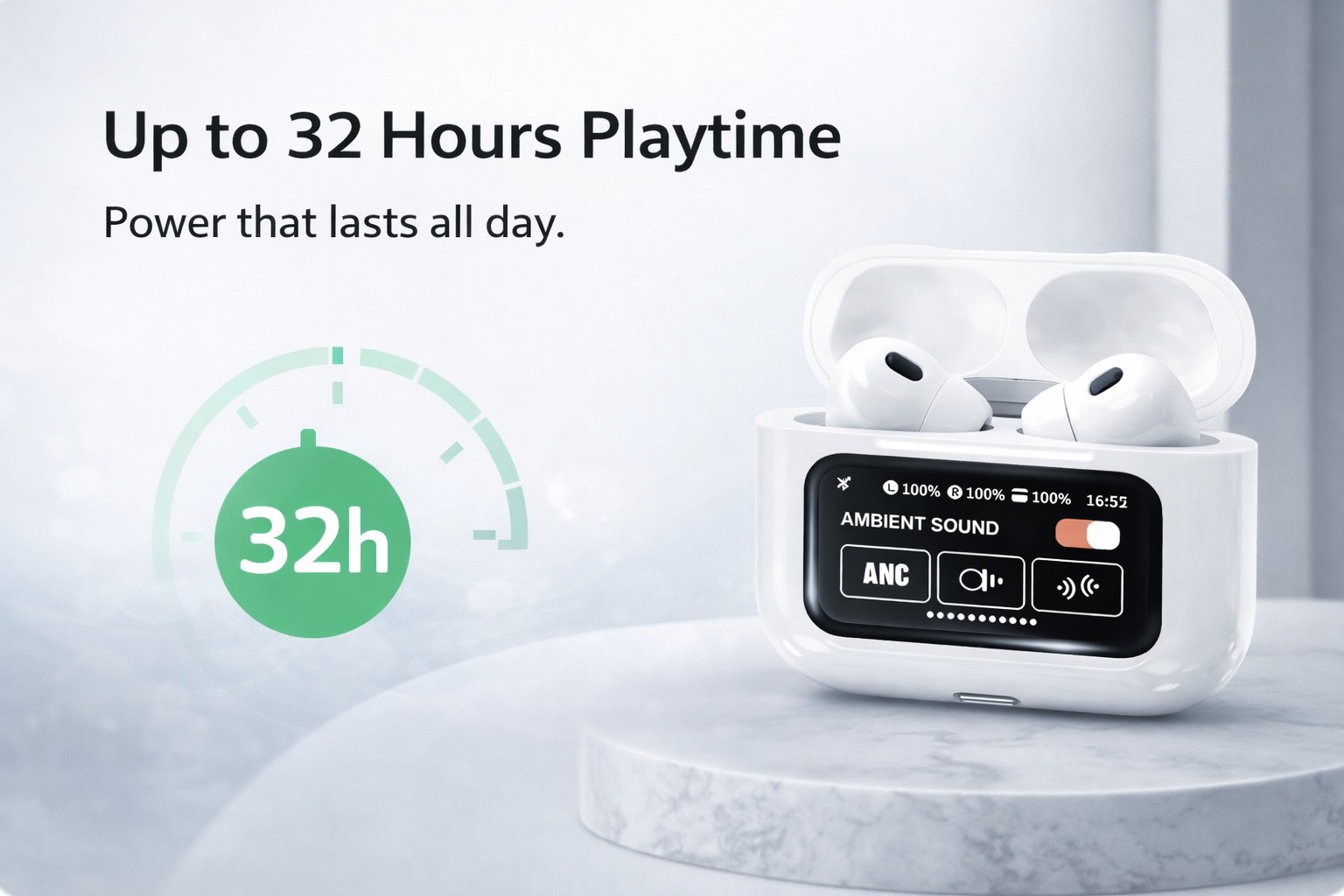 Stay powered throughout the day with up to 32 hours of total playtime using the charging case. Reliable battery life for work, travel, and everyday use.